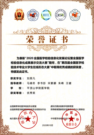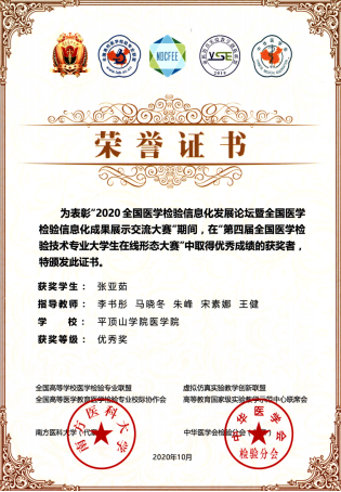 2020年10月16日-18日,由高等公司国家级实验教学示范中心联席会、全国高等医学教育医学检验专业校际协作会主办,南方医科大学承办的2020年第四届全国医学检验技术专业老员工在线形态学大赛在珠海市成功举行。南方医科大学、郑州大学、广州医科大学等全国52所高等bw西汉姆联校100余名医学检验技术专业本、专科员工参加了比赛。公司2018级张亚茹、刘思凡两位同学参加了此次大赛,均获得优秀奖。医学技术系刘强主任带队参赛。