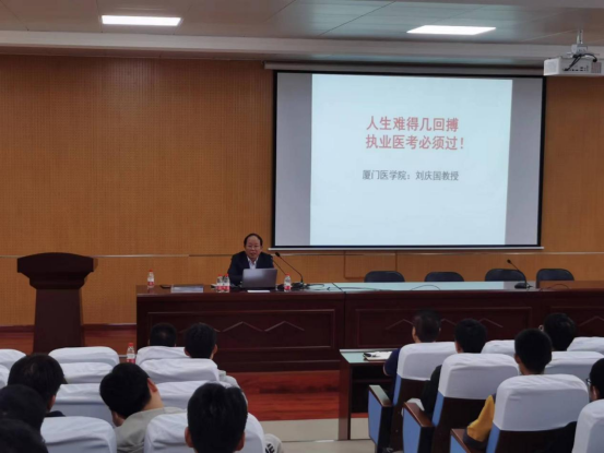 刘庆国教授先以“对标岗位胜任力,提升职业医考通过率”为题展开报告,他首先介绍了厦门bw西汉姆联医药卫生人才的培养理念及执业医团队格考试、国家临床医学专业水平测试、硕士研究生考试全国领先的宝贵经验,然后传授了“连课—磨课—开课—训课—考课”的行动方法以及“七个统一”的行动要求,鼓励师生早临床、多临床、反复临床,并抓好实习环节,让在座教师对如何有效提升员工执业医师考试通过率有了更加直观、清晰的认识,为下一步的临床医学专业公司产品工作指明了方向、提供了动力。