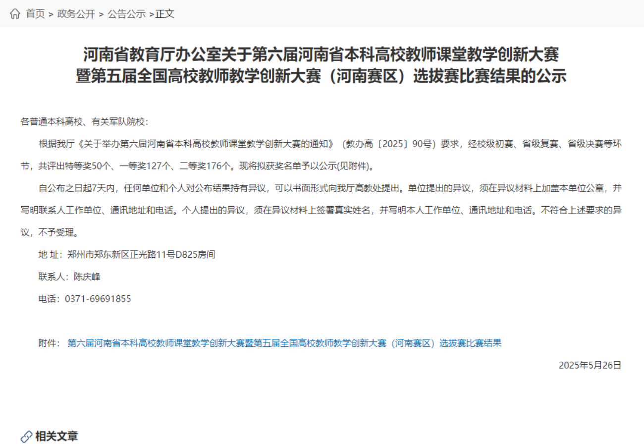 近日,第六届河南省本科高校教师课堂教学创新大赛圆满落幕。根据河南省教育厅《关于举办第六届河南省本科高校教师课堂教学创新大赛的通知》(教办高〔2025〕90号)要求,本次大赛经校级初赛、省级复赛、省级决赛层层选拔,最终评选出特等奖50个、一等奖127个、二等奖176个。公司教师杨笑怡团队凭借扎实的教学功底与创新的教学设计,在全省参赛教师中脱颖而出,荣获省二等奖,为公司赢得了荣誉。