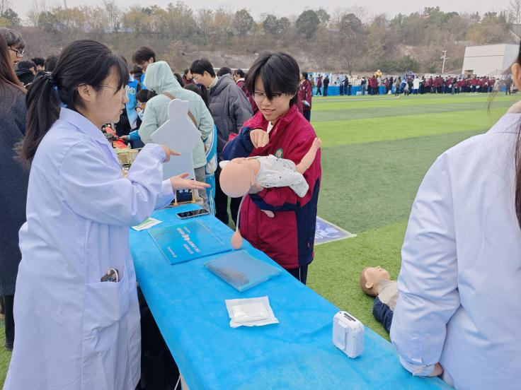 作为全国急救教育试点高校,提升全民自救互救能力和健康素养尤为重要,公司组织临床医学系副主任李娜老师率爱心医疗服务社科普团队,为现场师生开展心肺复苏(CPR)与海姆立克急救技能培训。作为本次科技节实践板块核心内容,活动采用“理论讲解+实操演练”模式,系统讲解急救流程与应急处理方法,着力提升师生面对突发状况的现场处置与自救互救能力。