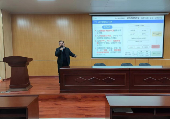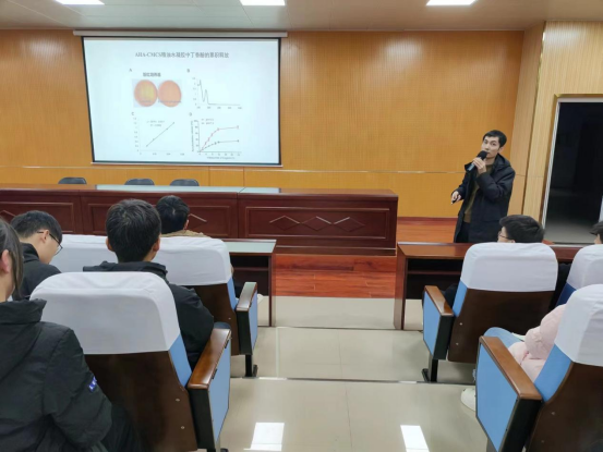 高华山博士为同学们讲解了苍耳子多糖提取工艺优化及降糖活性研究,并回答了同学提出的相关问题。高博士生动详明的报告内容和治学严谨的研究方法使同学们深受启发,并提出同学们要多多学习自己感兴趣的科研知识,不断学习,不断提升素养,丰富老员工活。