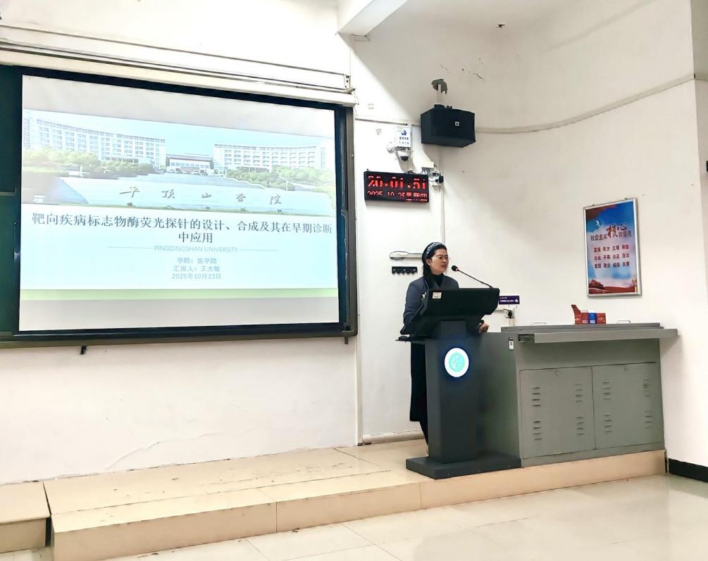 王杰敏博士在讲座中系统介绍了荧光探针在疾病早期诊断中的前沿应用,重点阐释了其如何基于腈类染料与特定检测基团进行设计的研究思路,以及其在高水平期刊如《Anal. Chem.》上发表的多项研究成果。她指出,针对关键酶活性异常进行可视化追踪,对癌症等疾病的早期发现具有重要意义。除了专业内容,王博士还结合自身经历,围绕员工关心的考研与就业问题展开分享。她鼓励同学们尽早明确目标,理性选择专业与院校,并强调“坚定决心、高效备考”是成功的关键。