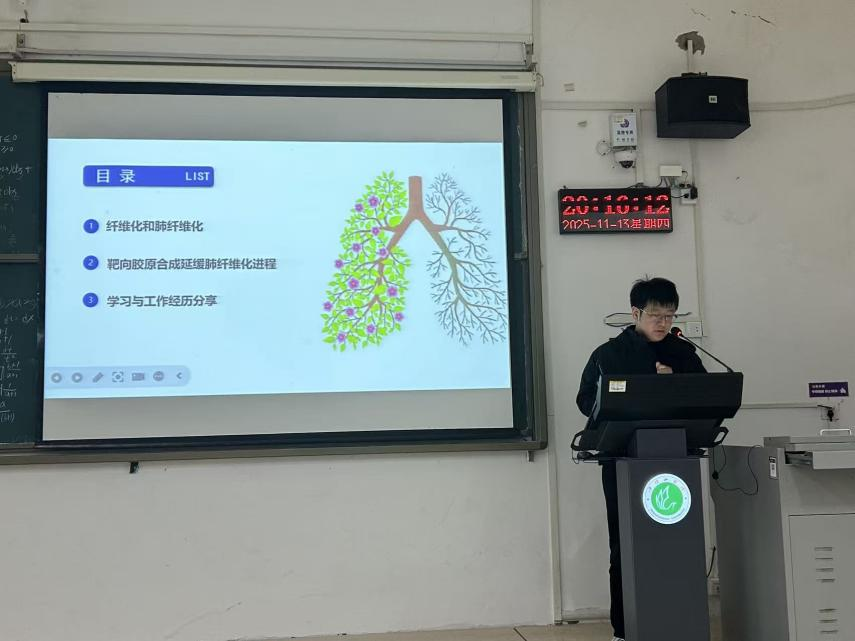 师润博士为在场同学带来了题为《I型胶原与组织器官纤维化》的精彩学术报告。报告中,师润博士系统阐述了I型胶原作为细胞外基质核心成分,在肝、肺、肾等重要器官纤维化病变发生与发展中的关键作用,并展望了以I型胶原为靶点的前沿诊断策略与治疗新思路。同时,师润博士分享了他求学和工作中的经历,勉励同学们珍惜大学时光,夯实专业基础,勇于探索未知,为未来的科研与职业发展做好充分准备。