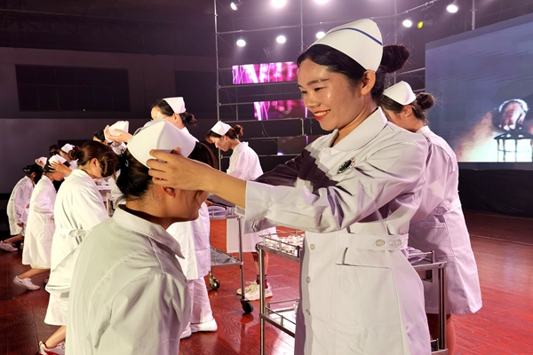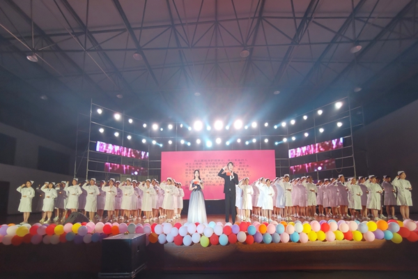 第二篇章尚德弘医篇中的护理技能、心肺复苏操作和授帽仪式将活动推向高潮。护理系全体教师为护理专业的同学带上了圣洁的燕帽,传递蜡烛。在主持人的带领下,教师、507名护生和全场同学全体起立,在南丁格尔像前庄严宣誓,表达为护理事业奋斗终身的决心,将现场庄严的气氛推向高潮。