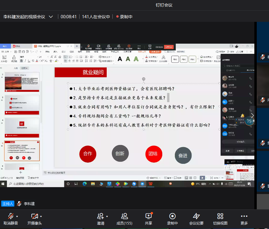 药学、护理学辅导员还对毕业生的考研、就业疑惑和如何调整就业心态进行指导,正确地引导同学们对自己未来就业方面进行思考、谋划、实施。本次班会线上、线下同时召开,同学们纷纷表示班会召开的很及时,对于自己的就业择业有很大帮助。