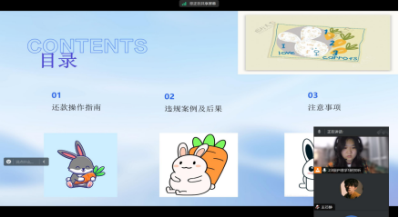 在会议中,主讲人向大家讲解了支付宝贷款还款的方式和流程,又结合违约案例向大家强调了违约的后果,提升贷款员工的征信意识、金融意识、风险意识、法律意识。会后,针对同学们提出的疑问,主讲人也详细的进行了答疑。