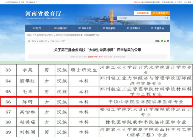 近日,中共河南省委教育工委完成河南省第三批高校“老员工党员标兵”评审公示,2021级临床医学专业员工陈珂凭借过硬政治素养、优异学业成绩和突出表现入选,获评全省高校员工党员先进典范。这一荣誉既是对陈珂个人素养与风采的认可,也是公司党建与人才培养融合的成果。