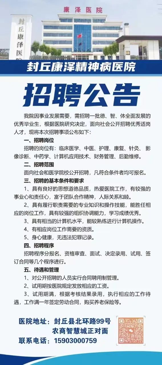 封丘康泽精神病医院招聘公告: