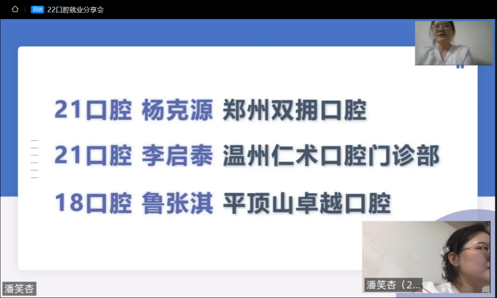 本次活动来自2021、2024届3位口腔医学专业毕业生进行就业经验分享,他们分别就职于平顶山、郑州和浙江温州的口腔诊所。会议中,2024届口腔医学专业毕业生杨克源、李启泰结合自身经历,从就业单位的选择、省内及南方城市的就业环境差异等几个方面进行了讲解,为同学们带来“第一手”的经验分享。公司首届口腔医学专业的毕业生鲁张淇从职业发展规划和口腔行业动态等多个方面为大家进行了细致讲解,鼓励同学们认真学习专业技能、抓住自我发展机遇。最后,与会院领导进行了总结,勉励各位同学要树立正确择业观、做好职业规划、确立发展方向。
