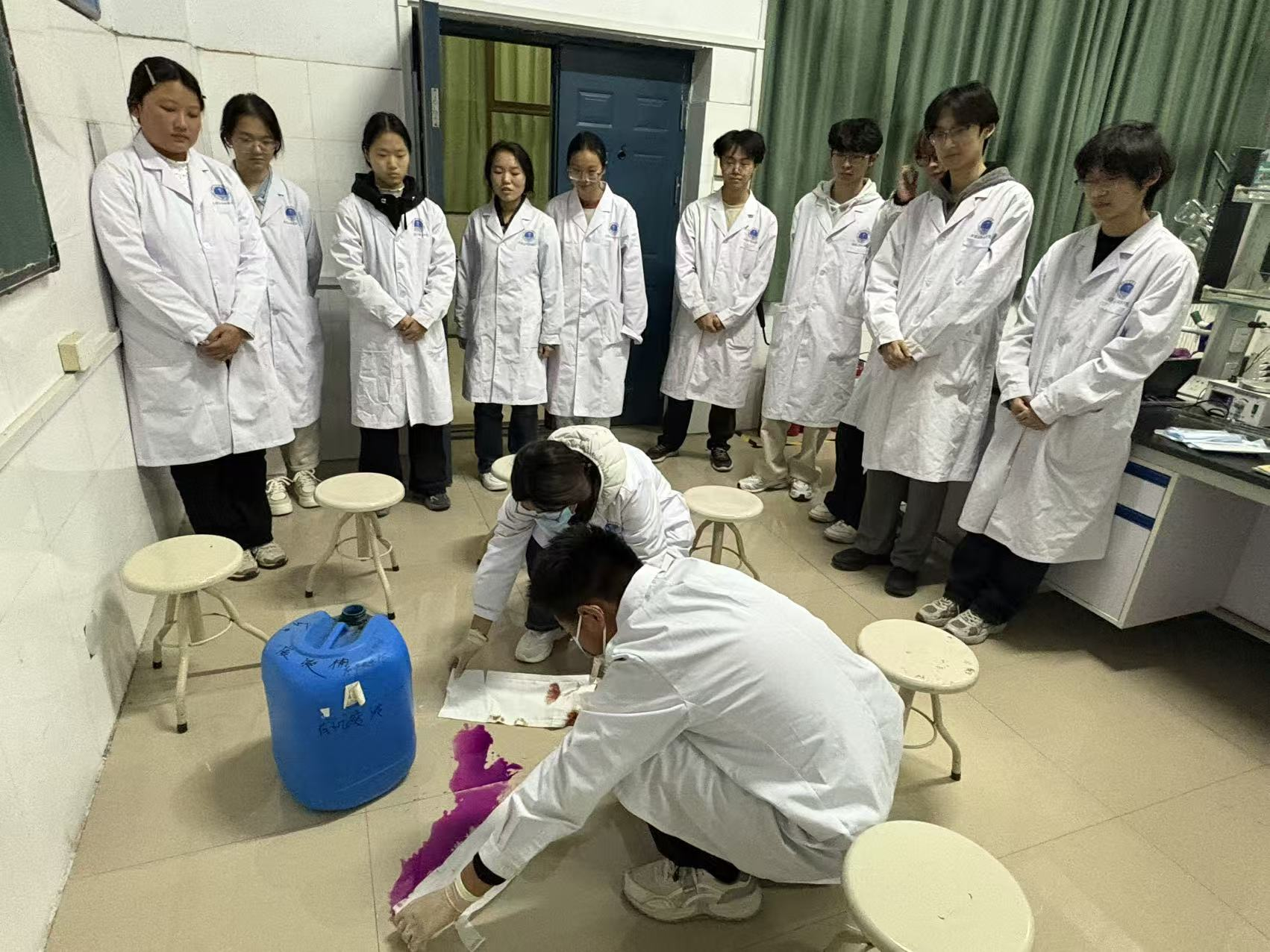 演练结束后,工作人员先对泄漏废液进行彻底清理与专业消杀,校医院人员同步对模拟涉事员工开展健康检查及风险评估,形成“险情处置 — 现场消杀 — 健康监测” 的完整闭环。整个处置流程历时约30分钟,各环节衔接紧密、操作规范、处置高效,充分展现了师生良好的应急素养。